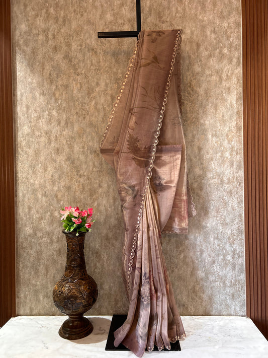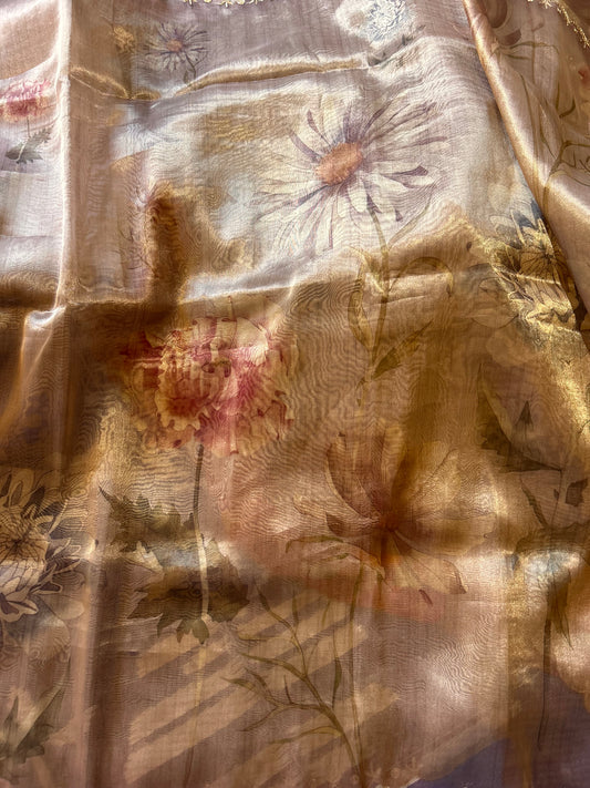 Wheat color Linen Tissue Saree with kantha work and rich Pallu